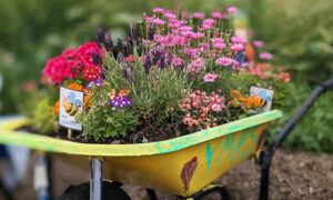 Wheelbarrows filled with plants and crafts can be seen lined up on High Street – all planted by primary schools.