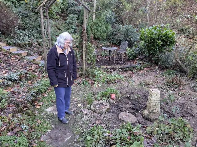 Linda Smith inspects her ruined garden after Storm Claudia
