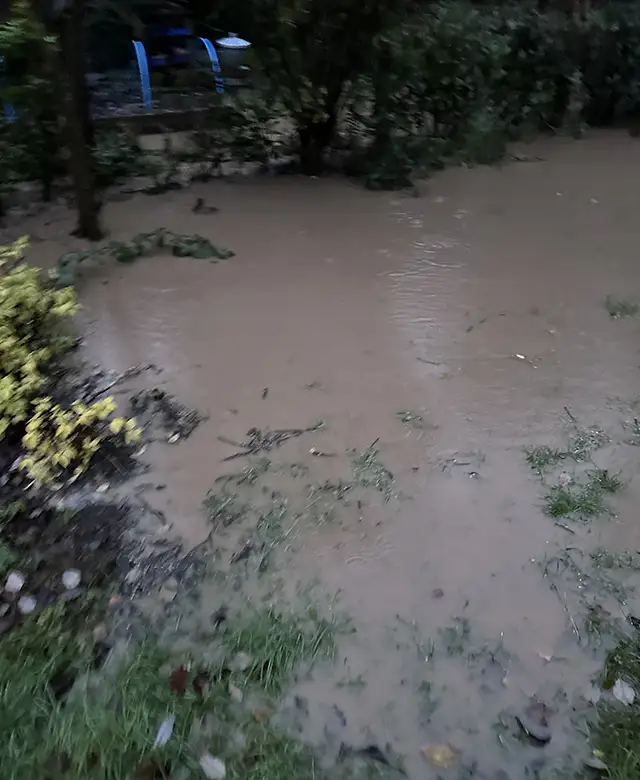 The latest flooding has happened today, with one garden left looking like a lake. It follows Storm Claudia a fortnight ago, when contractors working for Taylor Wimpey to stem the flow of water knocked out residents’ gas supplies.