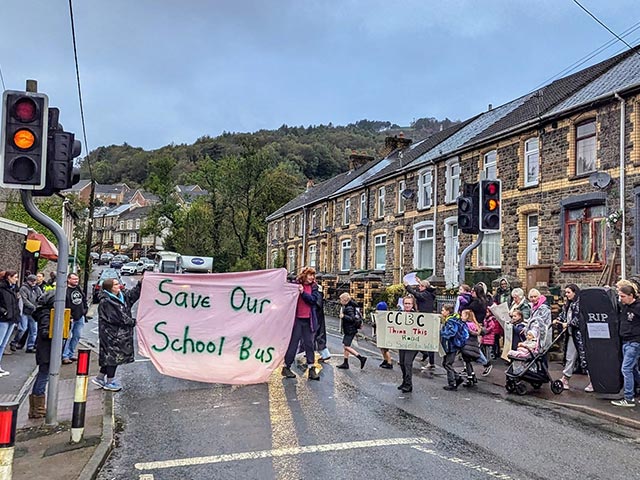 A protest in Wattsville, in October 2024, against proposed council cuts to school transport