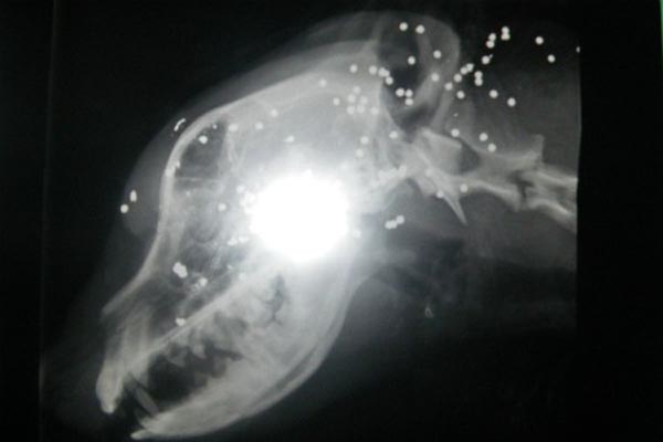 The dog was suffering from a swollen head and a large open wound on the left hand side of his face. An X-ray revealed 60 pellets lodged in the dog’s skull and to prevent further suffering was put down.
